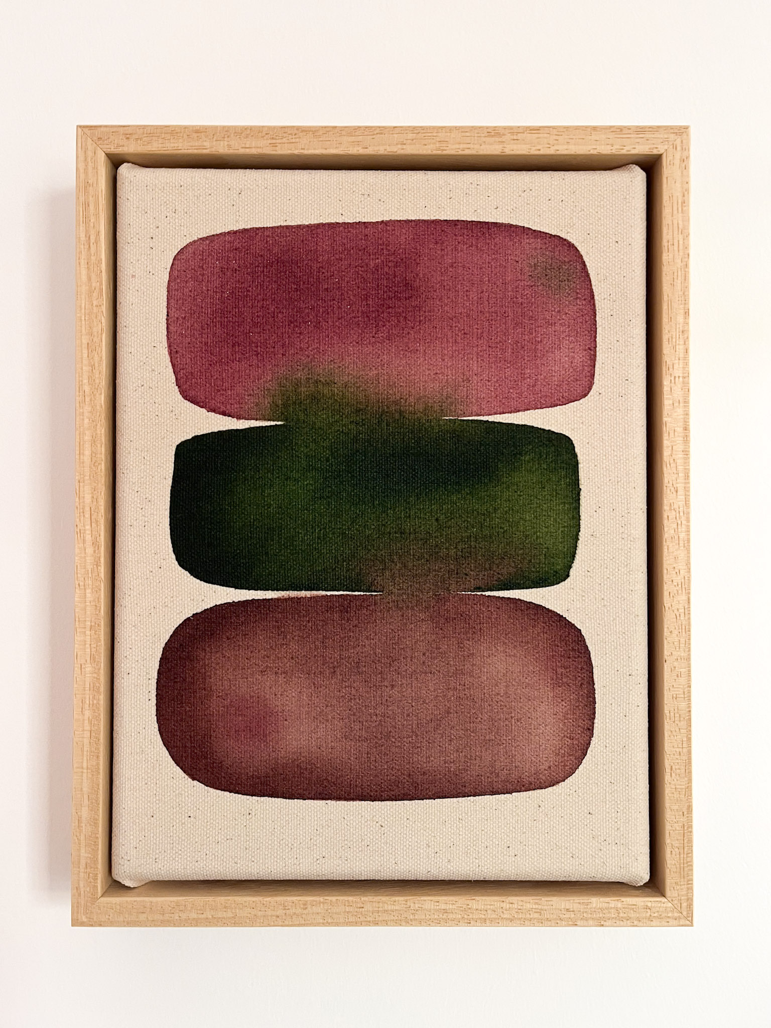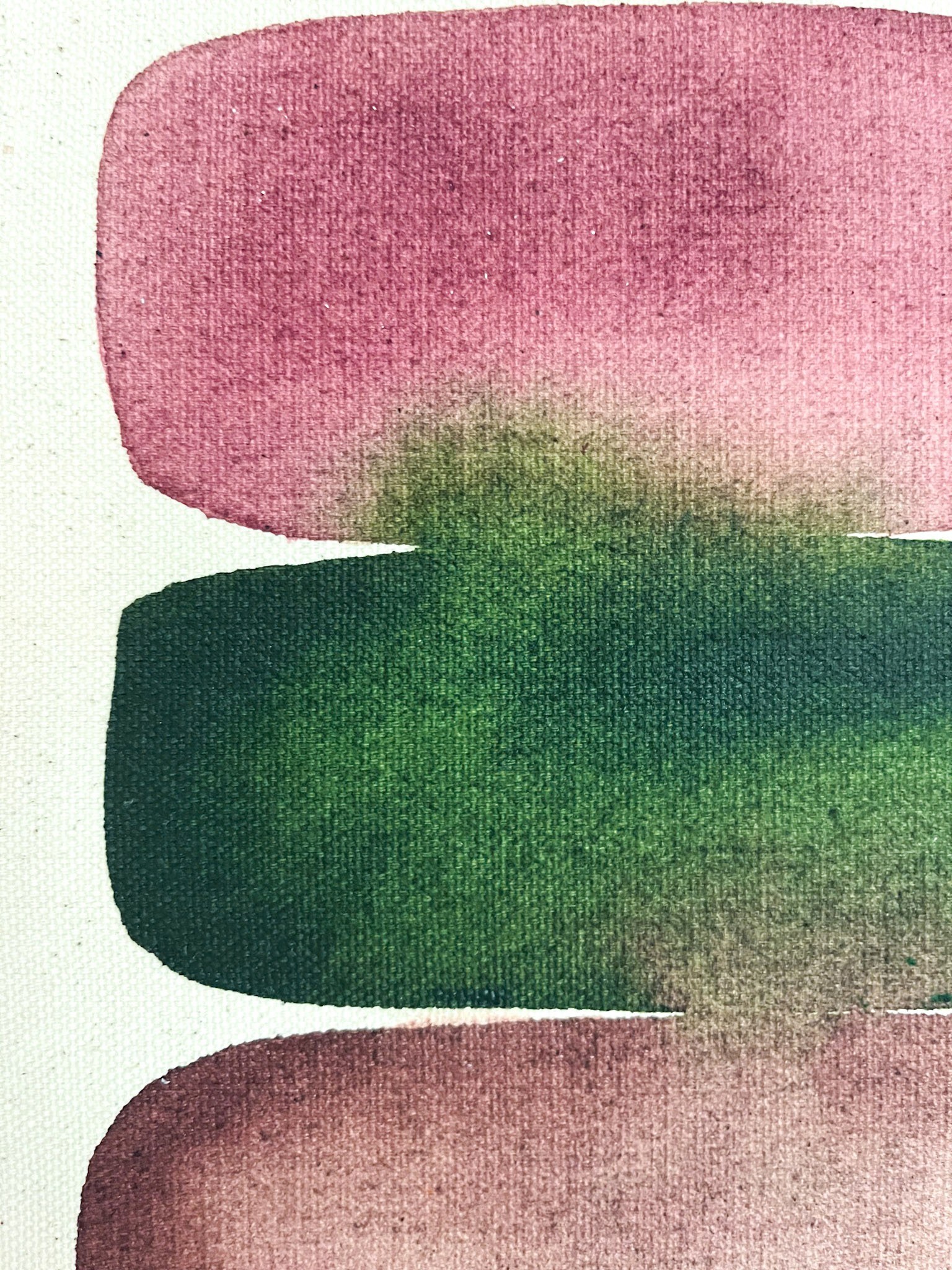 Through layered washes of acrylic and ink on raw cotton canvas, color and form merge like memories resurfacing. Transparent layers reveal traces of time and gesture, inviting the viewer to pause and reconnect with a sense of calm presence.